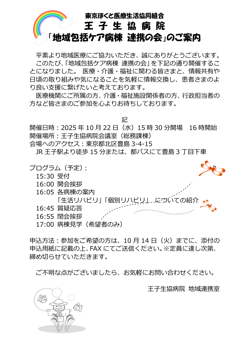 このたび、王子生協病院では「地域包括ケア病棟 連携の会」を開催する運びとなりました。