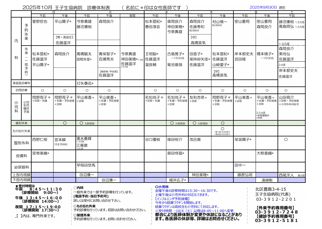 ※ | 都合により医師体制が変更や休診になることがあります。 各医師の休診等、詳細はお問い合わせください。 |